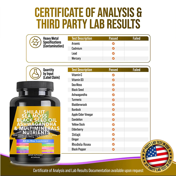 • Trusted Third-Party Validation: Our Shilajit Sea Moss 16 in 1 Supplements undergo rigorous 3rd party lab testings in USA, confirming its premium quality, free from contaminants, and delivering the pure essence of potent ingredients. Rest assured that our sea moss pills, shilajit capsules and ashwagandha supplements are meticulously formulated in a registered and certified facility right here in the USA. With our products, you won’t find any unnecessary preservatives or fillers.